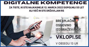 Sporočamo, prve termine neformalnih izobraževanj za odrasle nad 55 let na področju digitalnih kompetenc za leto 2022 – DIGIT 55+ Osnovno izobraževanje VKLOPI.SE (Maribor): 22.8. do 29.8.2022 Osnovno izobraževanje VKLOPI.SE (Poljčane): 22.8. do 29.8.2022 Osnovno izobraževanje VKLOPI.SE (Hoče): 31.8. do 7.9.2022 Osnovno izobraževanje VKLOPI.SE (Maribor): 31.8. do 7.9.2022