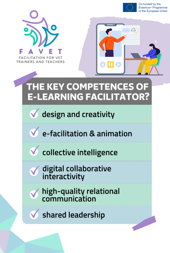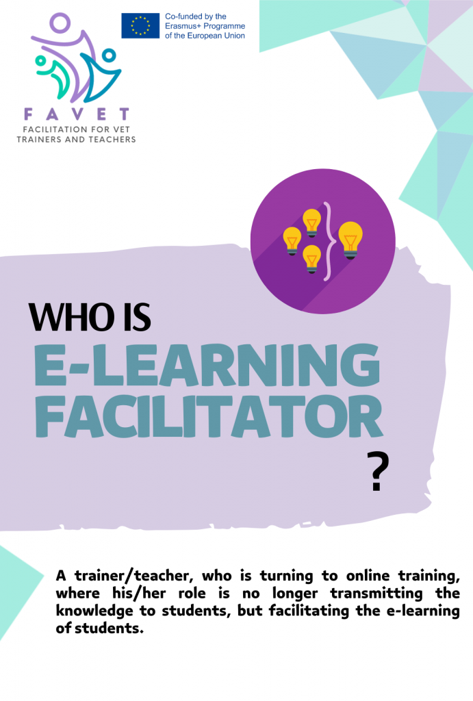 FaVET nagovarja izzive, s katerimi se srečuje mnogo učiteljev/trenerjev, ki prehajajo na poučevanje na daljavo in s tem prevzemajo novo vlogo – postajajo e-fasilitatorji učenja. Oblikovali smo model potrebovanih kompetenc e-fasilitatorja, sedaj pa aktivno pripravljamo kratke učne module in interaktivne igre, ki bodo omogočili razvoj potrebovanih kompetenc e-fasilitatorjev.